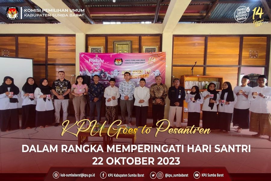 KPU Kabupaten Sumba Barat melaksanakan Kegiatan KPU Goes to Pesantren dan Nonton Bareng Film Pemilu "Kejarlah Janji", bertepatan dengan hari Santri 22 oktober 2023 di Pondok Pesantren Baitul Hikmah Putra Waikabubak. Dalam kegiatan ini hadir Anggota KPU Provinsi Nusa Tenggara Timur Jeffry A. Galla, Ketua, Anggota, Sekretaris, Kasubbag dan seluruh staf KPU Kabupaten Sumba Barat, Mahasiswa Prakering serta para Pengurus Pondok Pesantren Baitul Hikmah Putra Waikabubak.