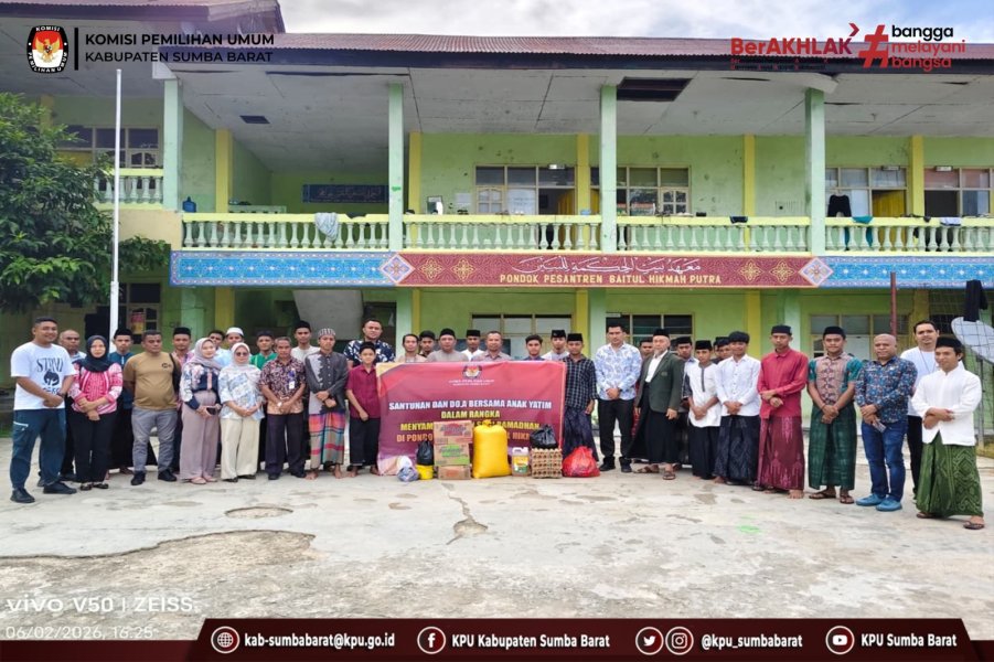 Waikabubak, kab-sumbabarat.kpu.go.id – Menjelang datangnya bulan suci Ramadhan 1447 Hijriah, Komisi Pemilihan Umum Kabupaten Sumba Barat menggelar kegiatan spiritual dan sosial bertajuk “Doa Bersama dan Santunan Anak Yatim”. Acara berlangsung khidmat di Pondok Pesantren Baitul Hikmah. Kegiatan tersebut dihadiri langsung oleh Ketua KPU Kabupaten Sumba Barat, Teguh Rahardjo, bersama para anggota KPU yakni Agusalim Ahmad, Muhammadiyah, Ridwan Mias Kamodo, dan Oktavianus Malo. Turut hadir Sekretaris KPU Sumba Barat, Pura Pajangu, para kepala subbagian, staf pelaksana, serta para santri dan anak yatim yang bermukim di pondok pesantren tersebut. Dalam sambutannya, Teguh Rahardjo menegaskan bahwa kegiatan ini bukan sekadar rutinitas tahunan, melainkan bentuk rasa syukur sekaligus upaya mempererat tali silaturahmi antara KPU dan masyarakat, khususnya lembaga pendidikan keagamaan. “Kami ingin menyambut bulan yang penuh berkah ini dengan hati yang bersih. Melalui doa bersama anak-anak yatim, kami berharap tugas-tugas kelembagaan yang kami emban ke depan senantiasa mendapat ridho dan kelancaran dari Tuhan Yang Maha Esa,” ujarnya. Acara dimulai pada sore hari dengan pembacaan doa bersama yang dipimpin oleh pengasuh pondok pesantren, Ustad Makmur Rodhi. Doa dipanjatkan untuk keselamatan bangsa serta kelancaran tahapan demokrasi di wilayah Sumba Barat. Selanjutnya, dilakukan penyerahan santunan berupa paket bantuan sembako secara simbolis kepada para santri dan anak yatim. Bantuan tersebut diharapkan dapat membantu memenuhi kebutuhan menjelang Ramadhan. Pihak Pondok Pesantren Baitul Hikmah menyambut baik kegiatan tersebut. Perwakilan pengasuh menyampaikan apresiasi atas kepedulian keluarga besar KPU Sumba Barat yang telah berbagi kebahagiaan bersama para santri. Selain sebagai bentuk kepedulian sosial, kegiatan ini juga menjadi momentum refleksi internal bagi jajaran KPU Sumba Barat untuk memperkuat integritas, kebersamaan, dan semangat pelayanan publik dalam menjalankan tugas-tugas kepemiluan. Nuansa religius yang menyelimuti acara diharapkan mampu memberikan energi positif menjelang berbagai agenda kelembagaan yang akan dilaksanakan ke depan. Kegiatan ditutup dengan foto bersama dan ramah tamah, menciptakan suasana penuh kekeluargaan menjelang datangnya bulan suci Ramadhan yang tinggal menghitung hari.