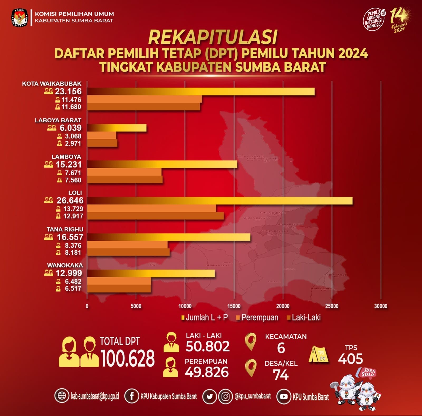 Komisi Pemilihan Umum Kabupaten Sumba Barat telah menetapkan Rekapitulasi Daftar Pemilih Tetap (DPT) sejumlah 100.628 pemilih yang terdiri atas 50.802 pemilih laki-laki dan 49.826 pemilih perempuan yang tersebar di 405 Tempat Pemungutan Suara (TPS) di 74 Kelurahan/Desa dan 6 Kecamatan (DPT).