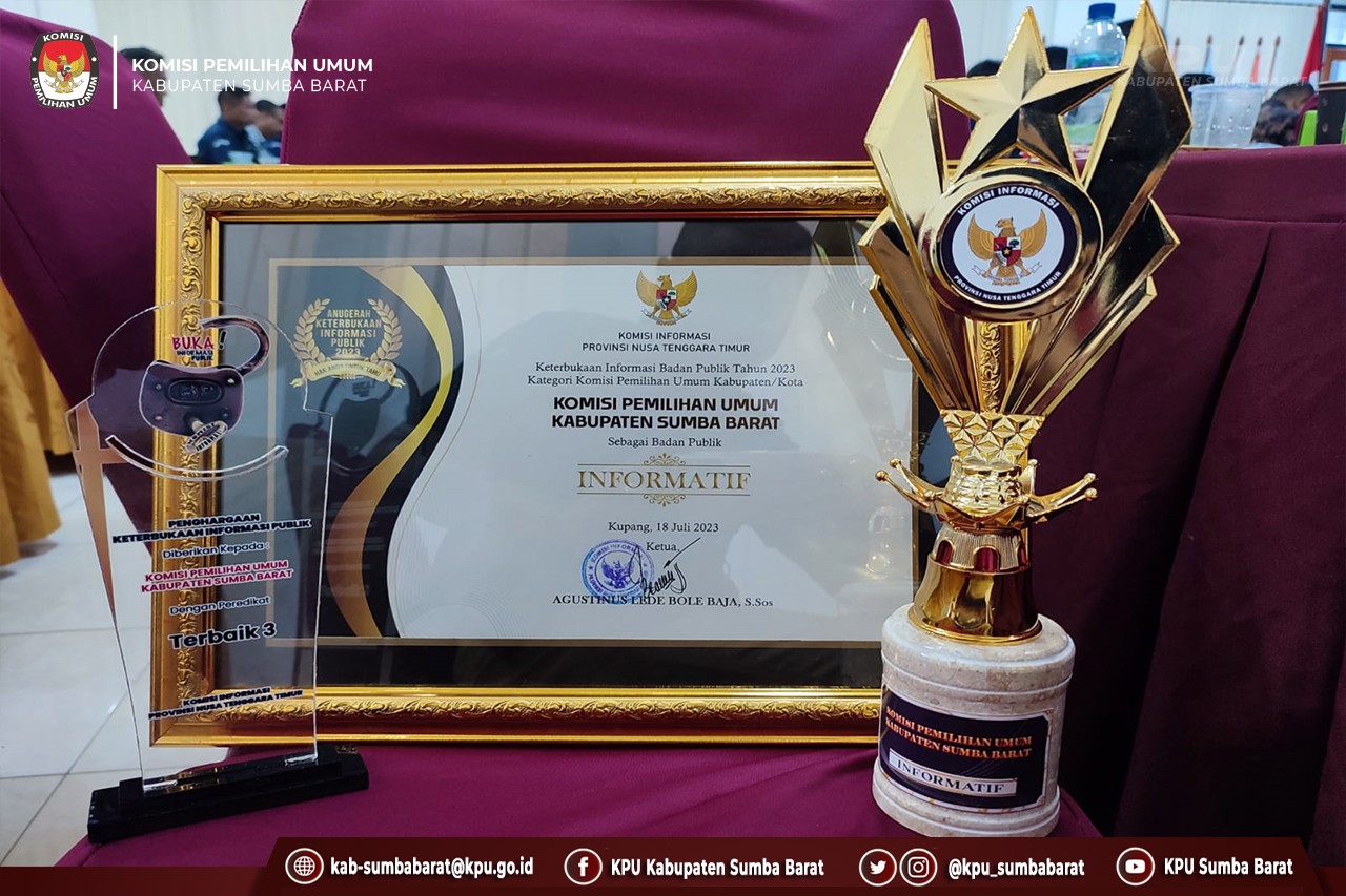 Kupang, kab-sumbabarat.kpu.go.id - KPU Kabupaten Sumba Barat meraih penghargaan sebagai Lembaga Publik Informatif Terbaik III. Penghargaan ini diberikan oleh Komisi Informasi Publik (KIP) Provinsi NTT pada Penganugerahan Keterbukaan Informasi Publik se-NTT tahun 2022, di Kupang, Selasa (18/7/2023).