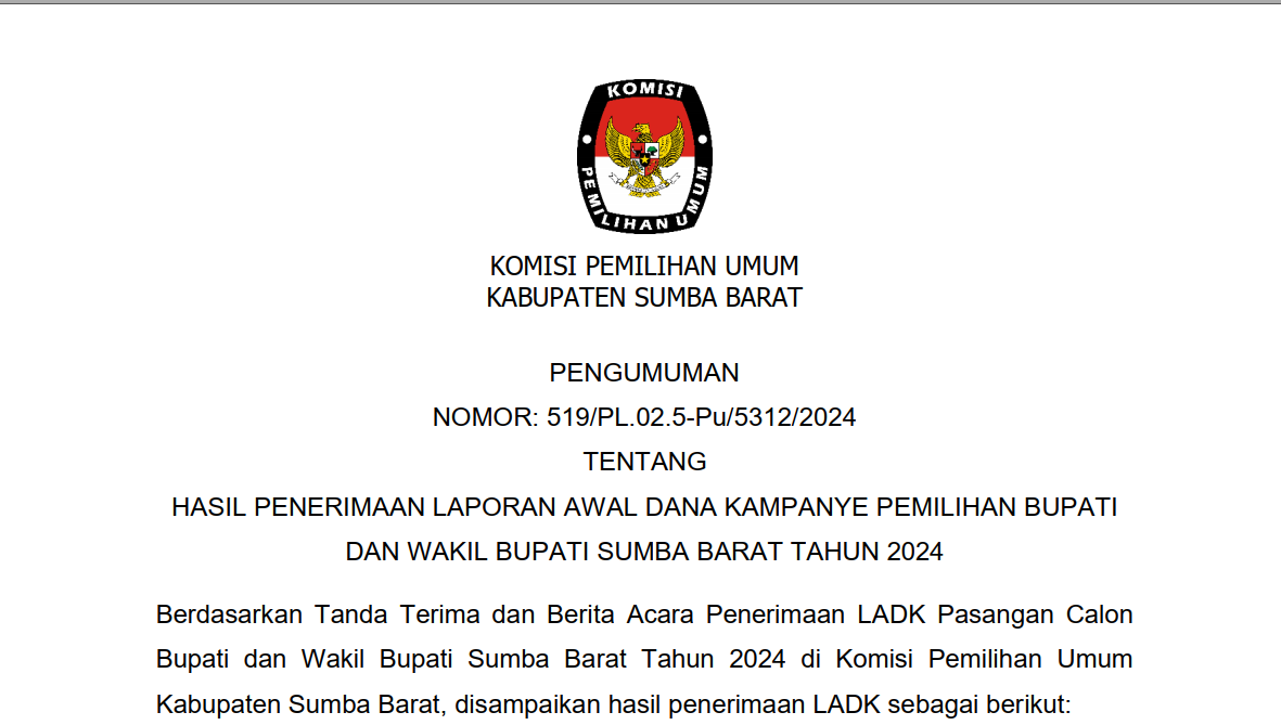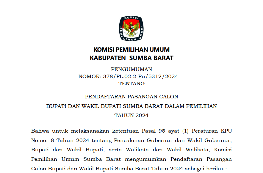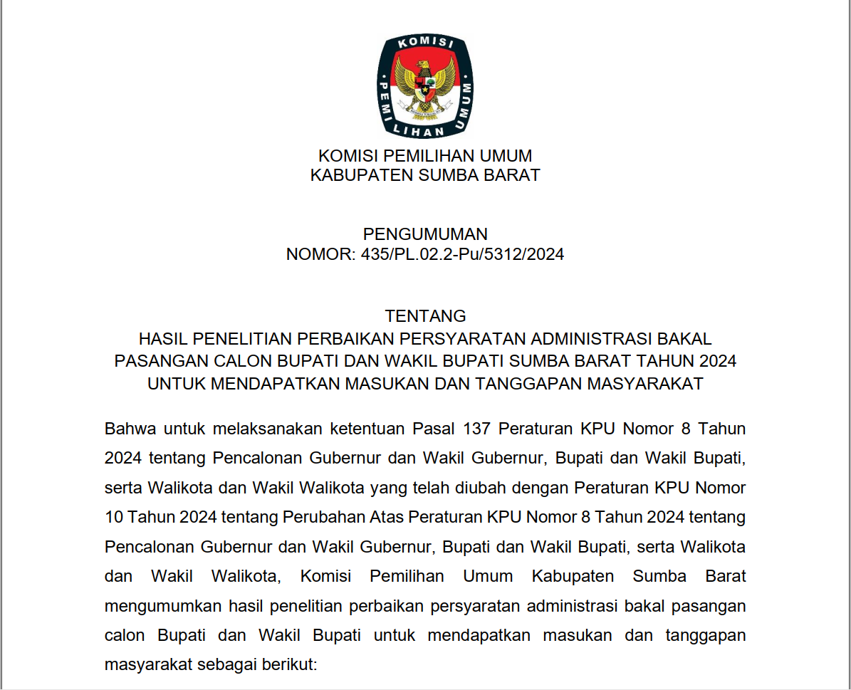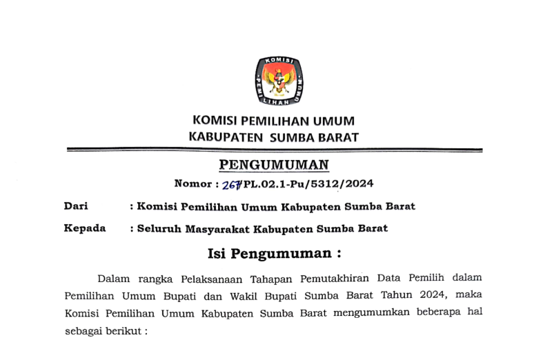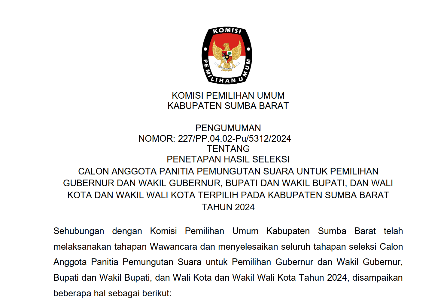Pengumuman Komisi Pemilihan Umum Kabupaten Sumba Barat Nomor 219/PP.04.2-Pu/5312/2024 tentang Penetapan Hasil Seleksi Calon Anggota Panitia Pemungutan Suara untuk Pemilihan Gubernur dan Wakil Gubernur, Bupati dan Wakil Bupati, dan Wali Kota dan Wakil Wali Kota pada Kabupaten Sumba Barat Tahun 2024.