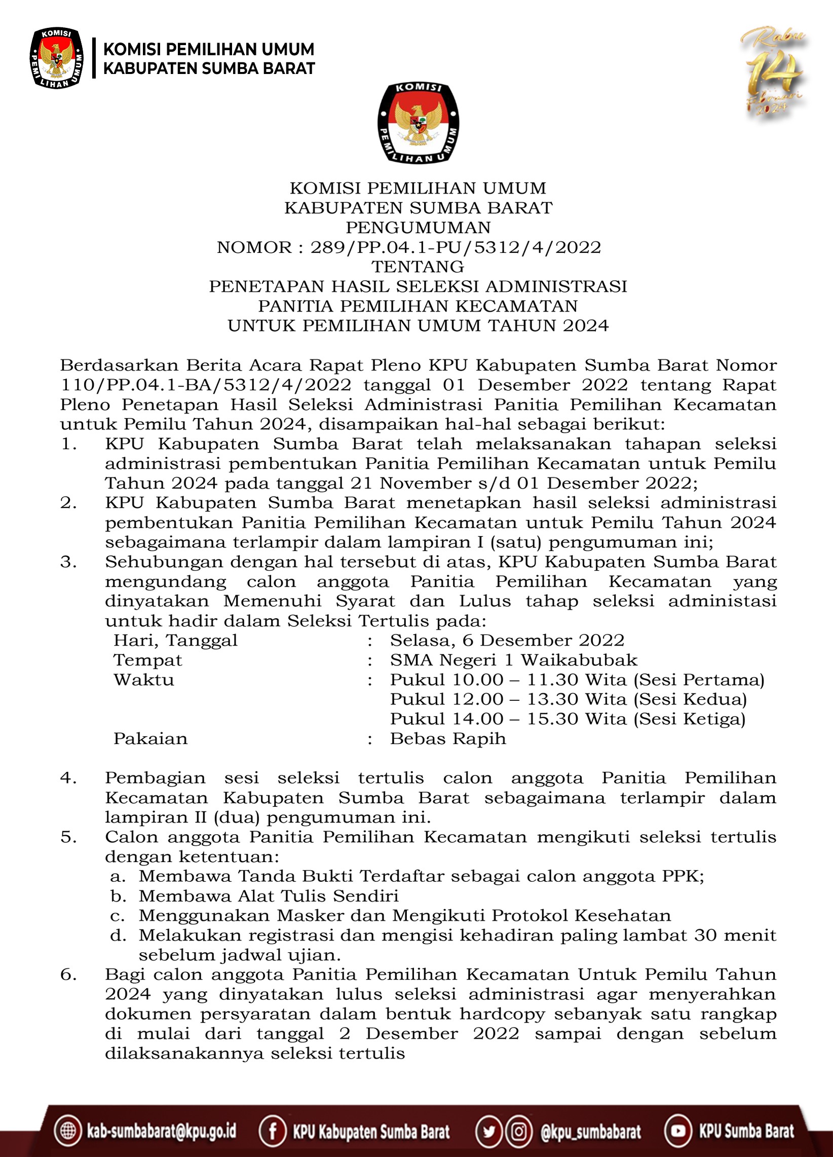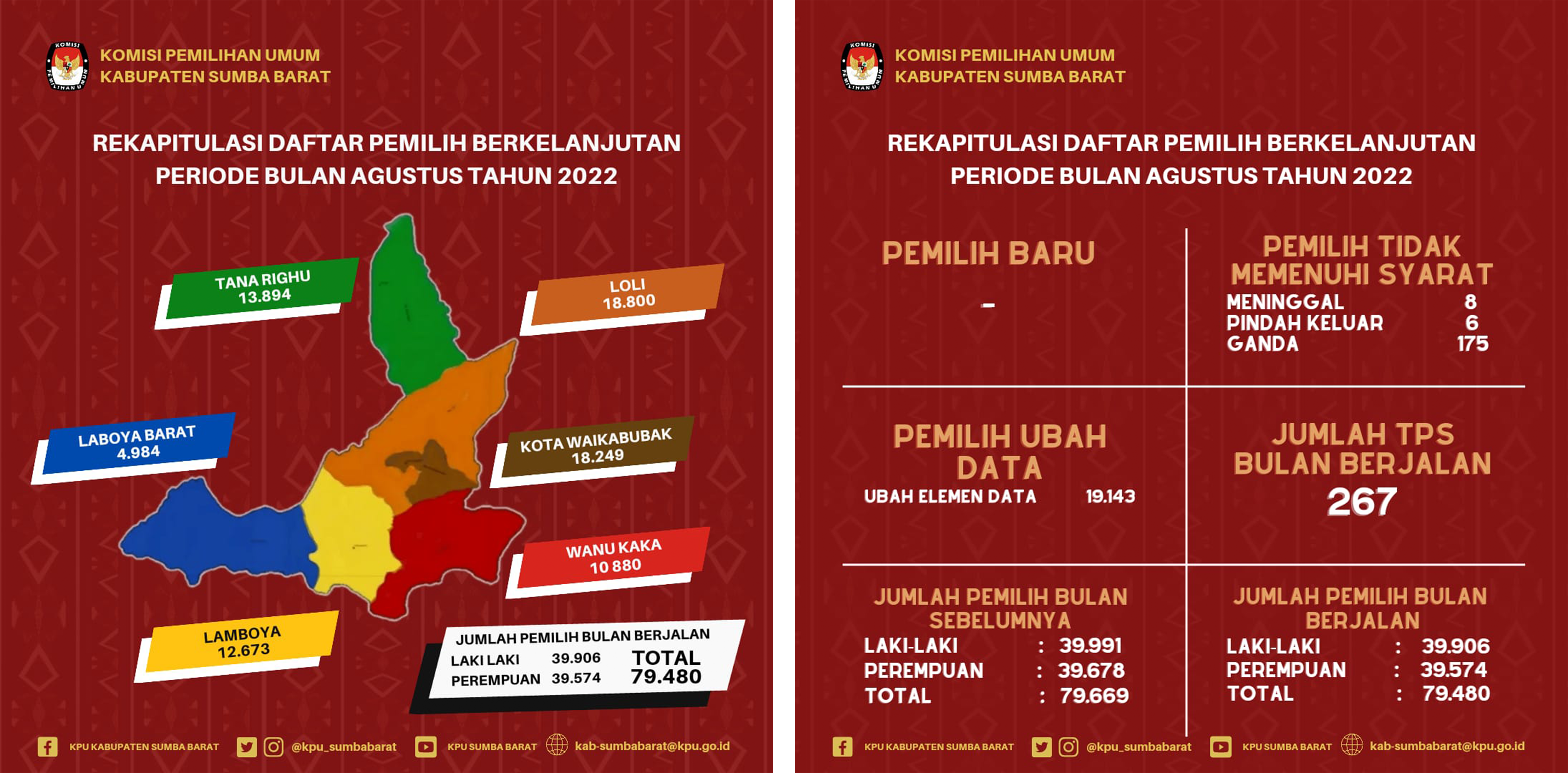 Selasa, 30 Agustus Tahun 2022 (10.00 WITA), KPU Kabupaten Sumba Barat melaksanakan Rapat Rekapitulasi Internal Pemutakhiran Daftar Pemilih Berkelanjutan Periode Bulan April Tahun 2022 dihadiri Ketua dan Anggota Komisioner, Sekretaris, Kepala Sub Bagian Perencanaan, Data, dan Informasi, dan Operator Sidalih KPU Kabupaten Sumba Barat, menghasilkan Daftar Pemilih Berkelanjutan Bulan Mei Tahun 2022 dengan Jumlah Pemilih Sebanyak 79.480 (Tujuh Puluh Sembilan Ribu Empat Ratus Delapan Puluh), dengan rincian pemilih laki-laki berjumlah 39.906 (Tiga Puluh Sembilan Ribu Sembilan Ratus Enam) dan pemilih perempuuan berjumlah 39.574 (Tiga Puluh Sembilan Ribu Lima Ratus Tujuh Puluh Empat) yang tersebar di 6 (enam) Kecamatan.
