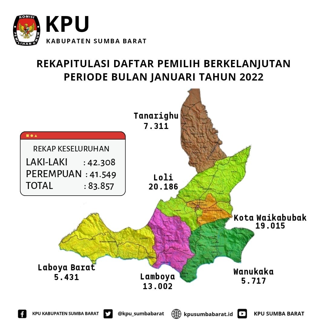 Daftar Pemilih Berkelanjutan bulan Januari Tahun 2022 dengan jumlah sebanyak 83.857 (Delapan Puluh Tiga Ribu Delapan Ratus Lima Puluh Tujuh), dengan rincian pemilih laki-laki berjumlah 42.308 (Empat Puluh Dua Ribu Tiga Ratus Delapan), dan pemilih perempuan berjumlah 41.549 (Empat Puluh Satu Ribu Lima Ratus Empat Puluh Sembilan) yang tersebar di 6 (Enam) Kecamatan.