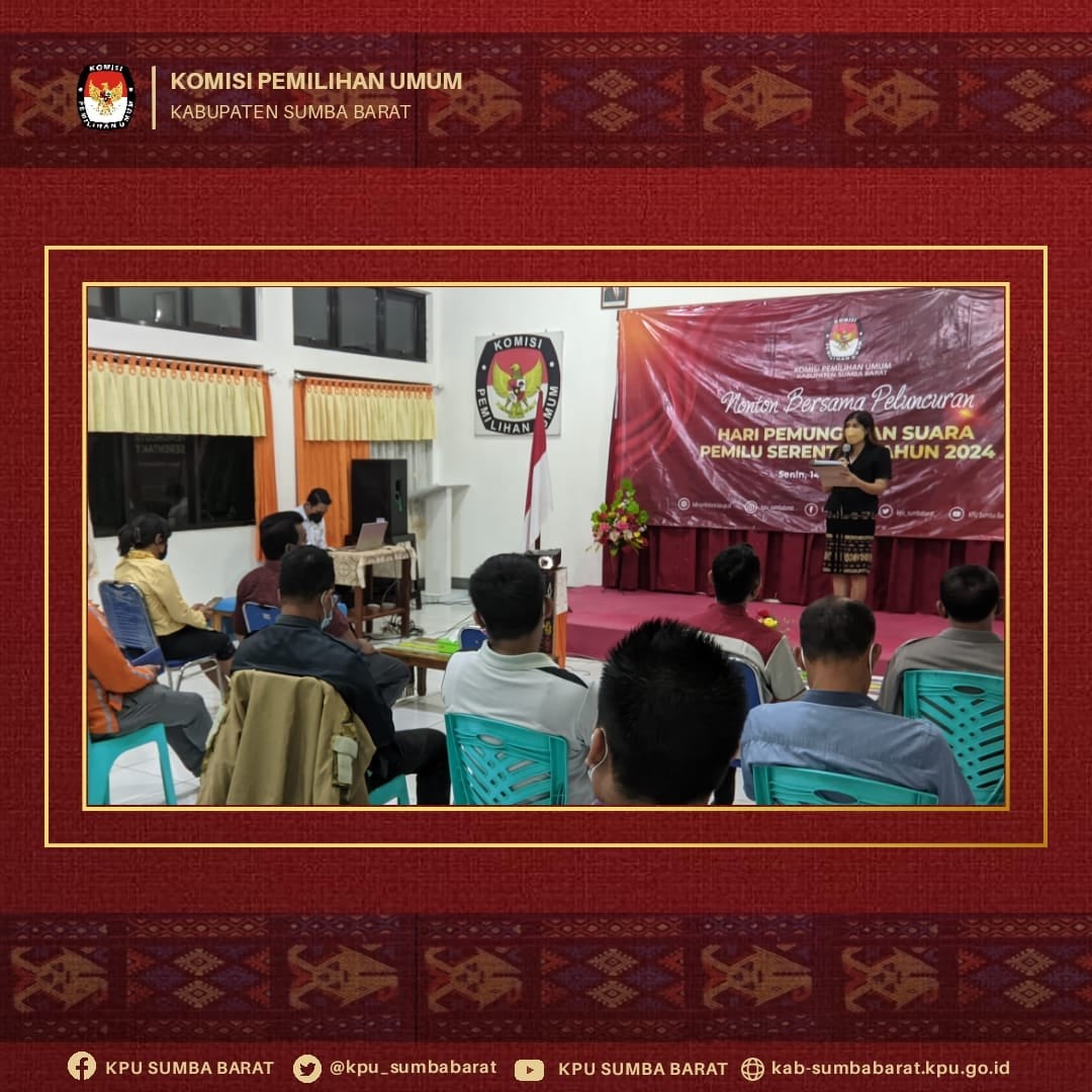 Waikabubak,kab-sumbabarat.kpu.go.id-- KPU Kabupaten Sumba Barat melaksanakan kegiataan Nonton Bersama Peluncuran Hari Pemungutan Suara Pemilu 2024 di aula Kantor KPU Kabupaten Sumba Barat, Senin (14/2/2022). Kegiatan yang diselenggarakan oleh KPU RI serta diikuti oleh seluruh satker KPU seluruh Indonesia di wilayah kerja masing masing dengan mengundang Forkompinda, Bawaslu serta Pimpinan Partai Politik. KPU RI Ilham Saputra dalam sambutannya menyampaikan bahwa saat ini KPU terus menyiapkan regulasi, SDM dan infrastrukur dalam rangka menyukseskan Pemilu dan Pemilihan Serentak 2024. Sementara dalam sapaan Ketua KPU Kabupaten Sumba Barat, Sri Demu Alemina br Bangun menyampaikan Pemilu dan Pemilihan Serentak Tahun 2024 merupakan momen terbesar dan bersejarah dalam Demokrasi di Indonesia, karena Pemilu dan Pemilihan dilaksanakan dalam tahun yang sama, untuk itu kita membutuhkan energi yang besar , tim yang solid , koordinasi yang efektif untuk mewujudkan kesuksesan sejarah dalam Demokrasi Indonesia. Energi yang besar itu sumbernya dari kita semua KPU, Bawaslu, Pemerintah, DPRD, TNI ,POLRI, Kejaksaan, Pengadilan, Pimpinan Partai Politik, dan tentunya seluruh masyarakat. Kita punya peran masing –masing untuk menyukseskan Pemillu dan Pemilihan 2024. Serta mengakhiri sapaannya Ketua KPU Kabupaten Sumba Barat menyampaikan harapan yang besar melalui kegiatan ini menjadi titik awal untuk kita Bersama sama mempersiapkan Pemilu 2024 yang LUBER JURDIL. (Hupmas/*)
